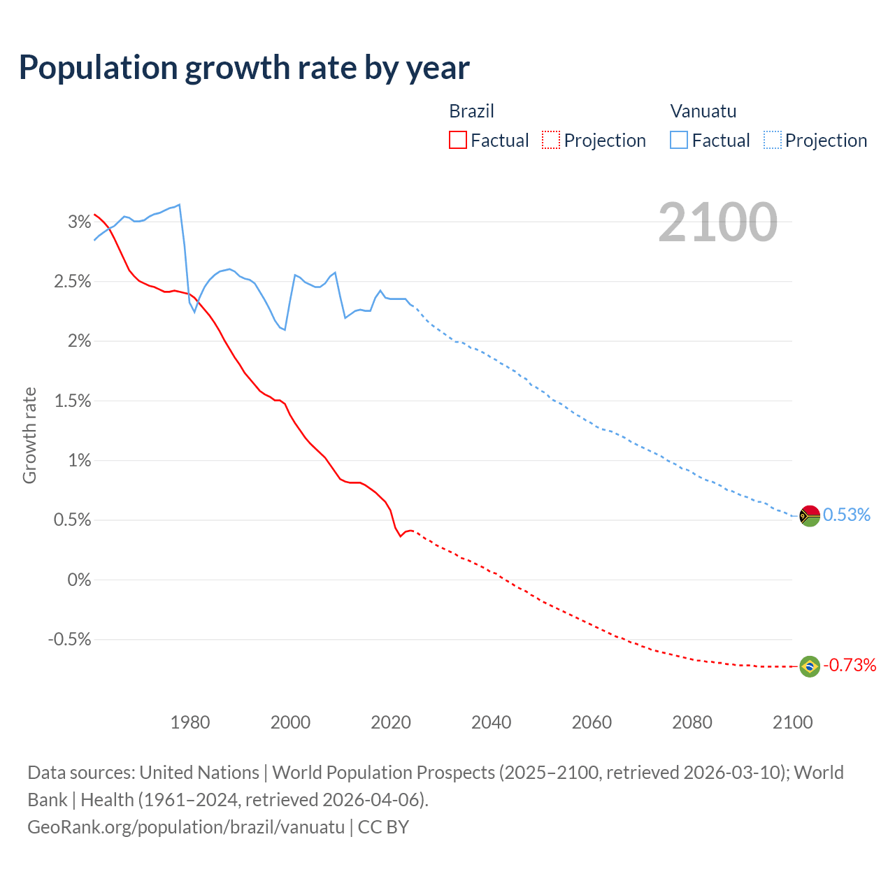 - For the last 10 years, Brazil has had an average growth rate of +0.6% per year vs +2.33% in Vanuatu.