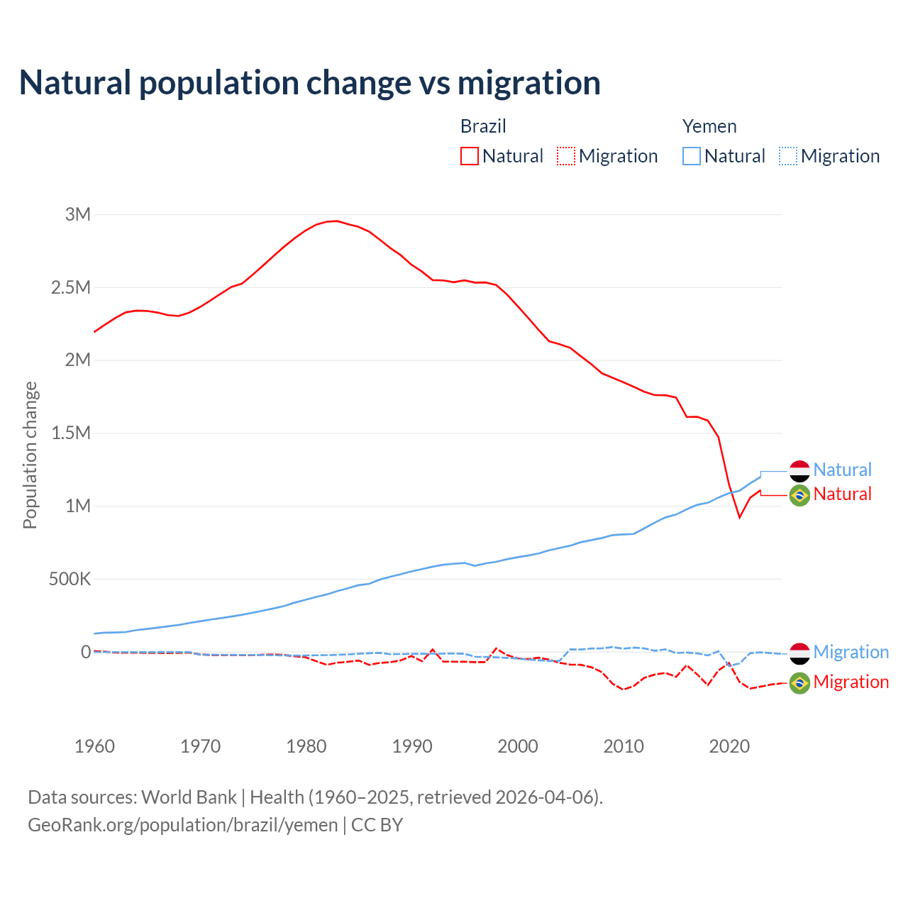 Over the last 10 years, 89.1% of the population change in Brazil is from natural causes (a gain of 14,004,164 people) and 10.9% is from migration (a loss of 1,708,894 people). In Yemen 97.8% is from natural causes (a gain of 10,460,813 people) and 2.17% is from migration (a loss of 231,814 people).