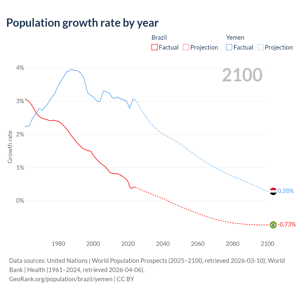 - For the last 10 years, Brazil has had an average growth rate of +0.6% per year vs +3% in Yemen.