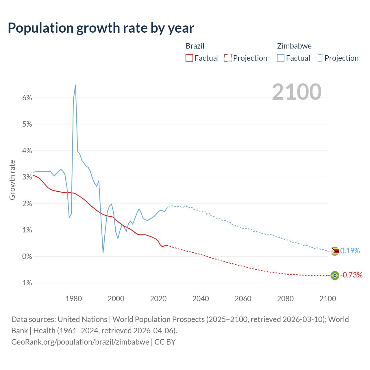 - For the last 10 years, Brazil has had an average growth rate of +0.6% per year vs +1.57% in Zimbabwe.