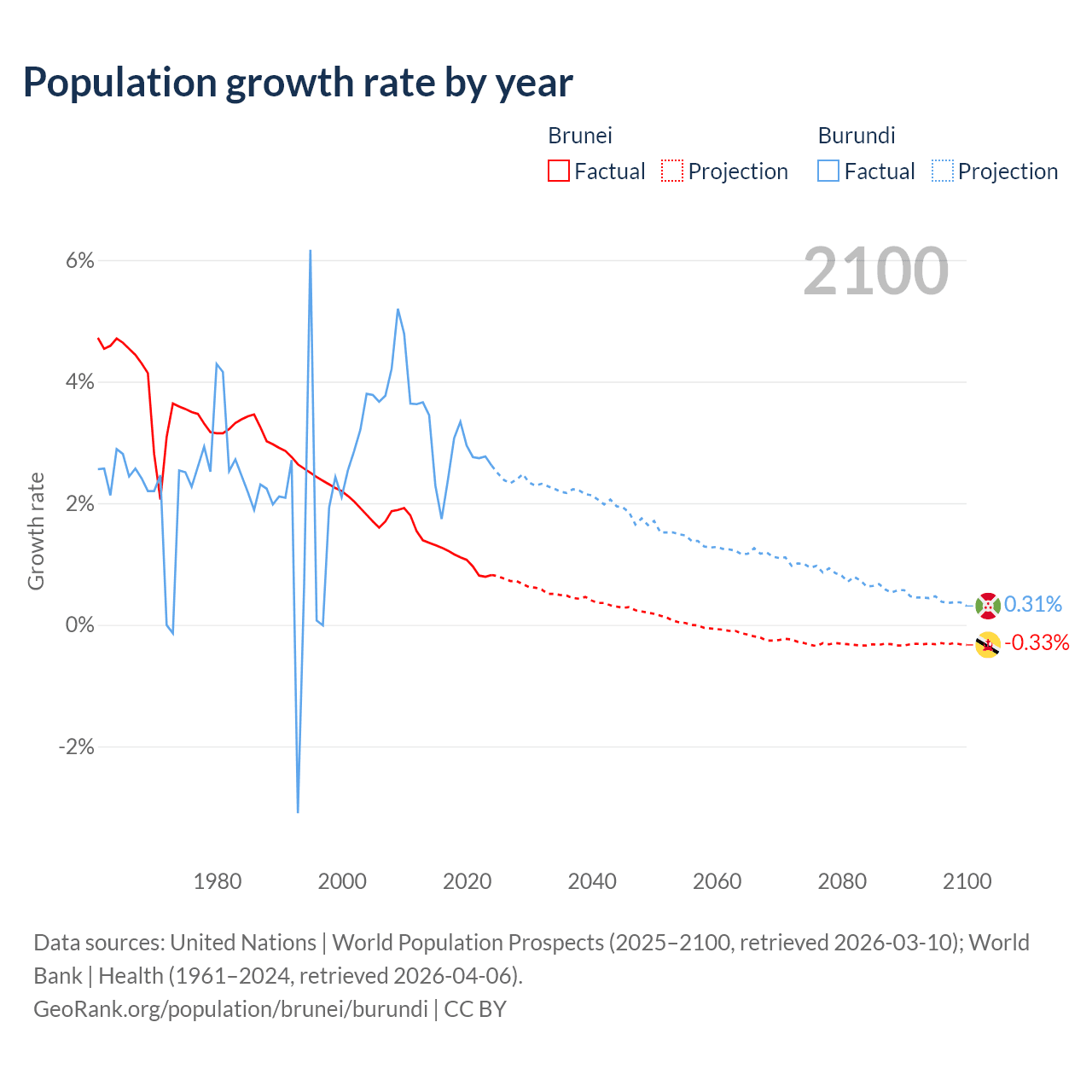 - For the last 10 years, Brunei has had an average growth rate of +1.08% per year vs +2.74% in Burundi.
