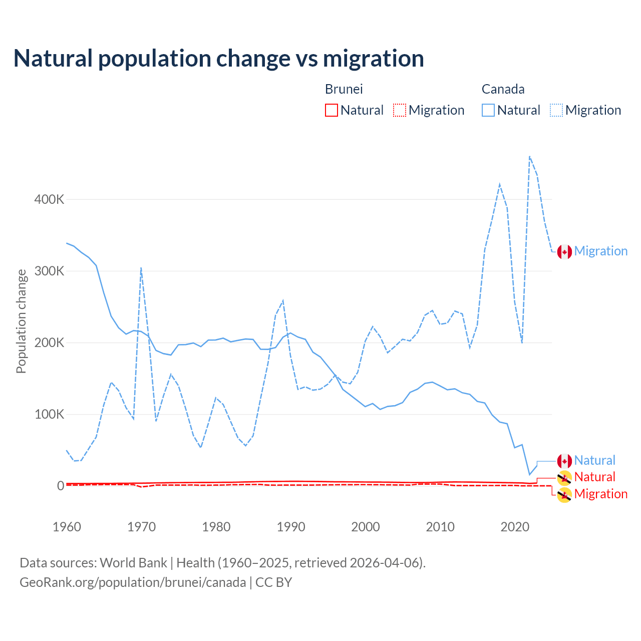 Over the last 10 years, 93.9% of the population change in Brunei is from natural causes (a gain of 43,993 people) and 6.15% is from migration (a gain of 2,882 people). In Canada 19.4% is from natural causes (a gain of 789,345 people) and 80.6% is from migration (a gain of 3,276,554 people).