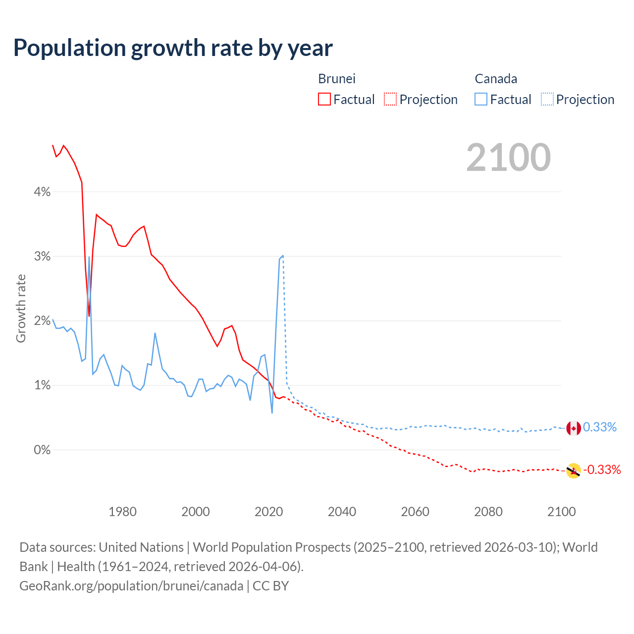 - For the last 10 years, Brunei has had an average growth rate of +1.08% per year vs +1.5% in Canada.