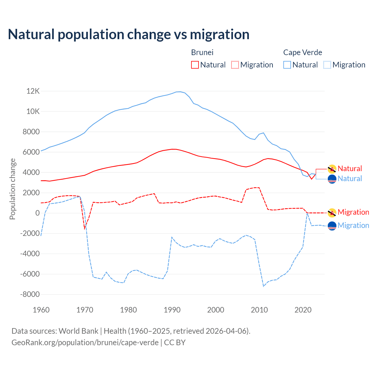 Over the last 10 years, 93.9% of the population change in Brunei is from natural causes (a gain of 43,993 people) and 6.15% is from migration (a gain of 2,882 people). In Cape Verde 56.4% is from natural causes (a gain of 50,193 people) and 43.6% is from migration (a loss of 38,879 people).