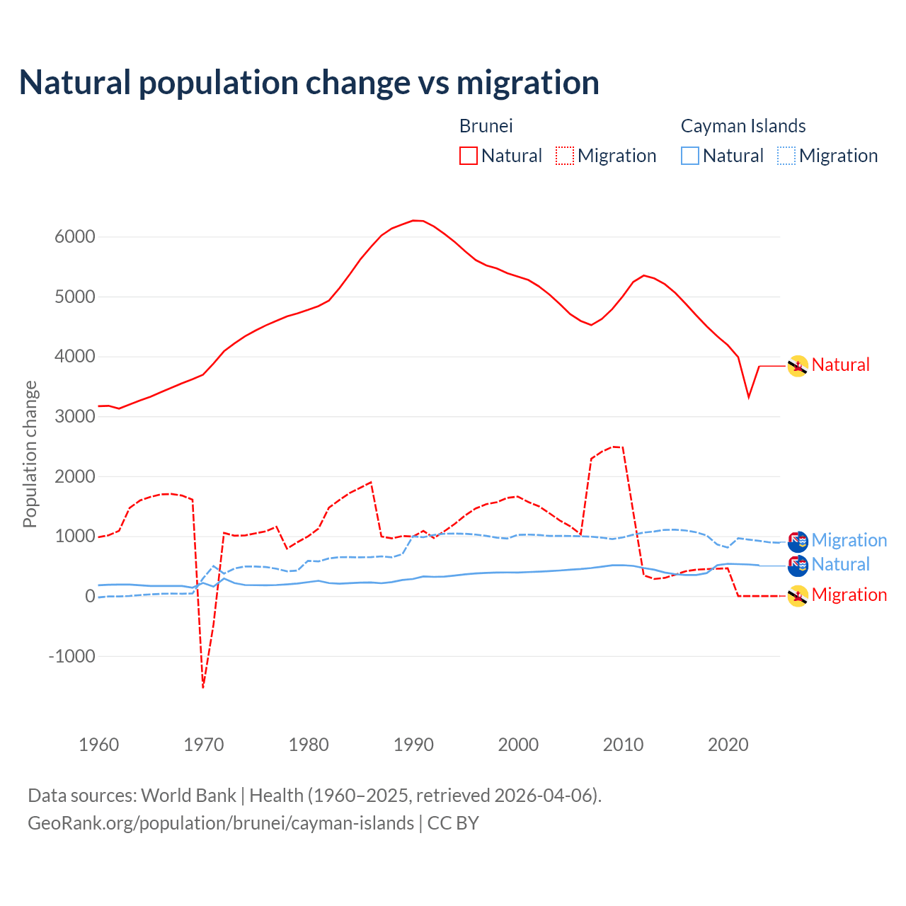 Over the last 10 years, 93.9% of the population change in Brunei is from natural causes (a gain of 43,993 people) and 6.15% is from migration (a gain of 2,882 people). In the Cayman Islands 31.1% is from natural causes (a gain of 4,468 people) and 68.9% is from migration (a gain of 9,879 people).