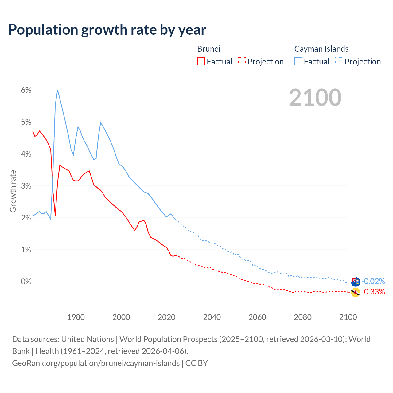 - For the last 10 years, Brunei has had an average growth rate of +1.08% per year vs +2.19% in the Cayman Islands.
