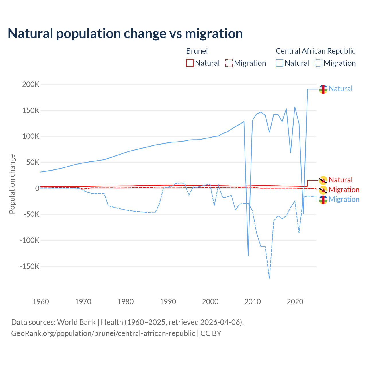Over the last 10 years, 93.9% of the population change in Brunei is from natural causes (a gain of 43,993 people) and 6.15% is from migration (a gain of 2,882 people). In the Central African Republic 66.7% is from natural causes (a gain of 1,164,312 people) and 33.3% is from migration (a loss of 580,593 people).
