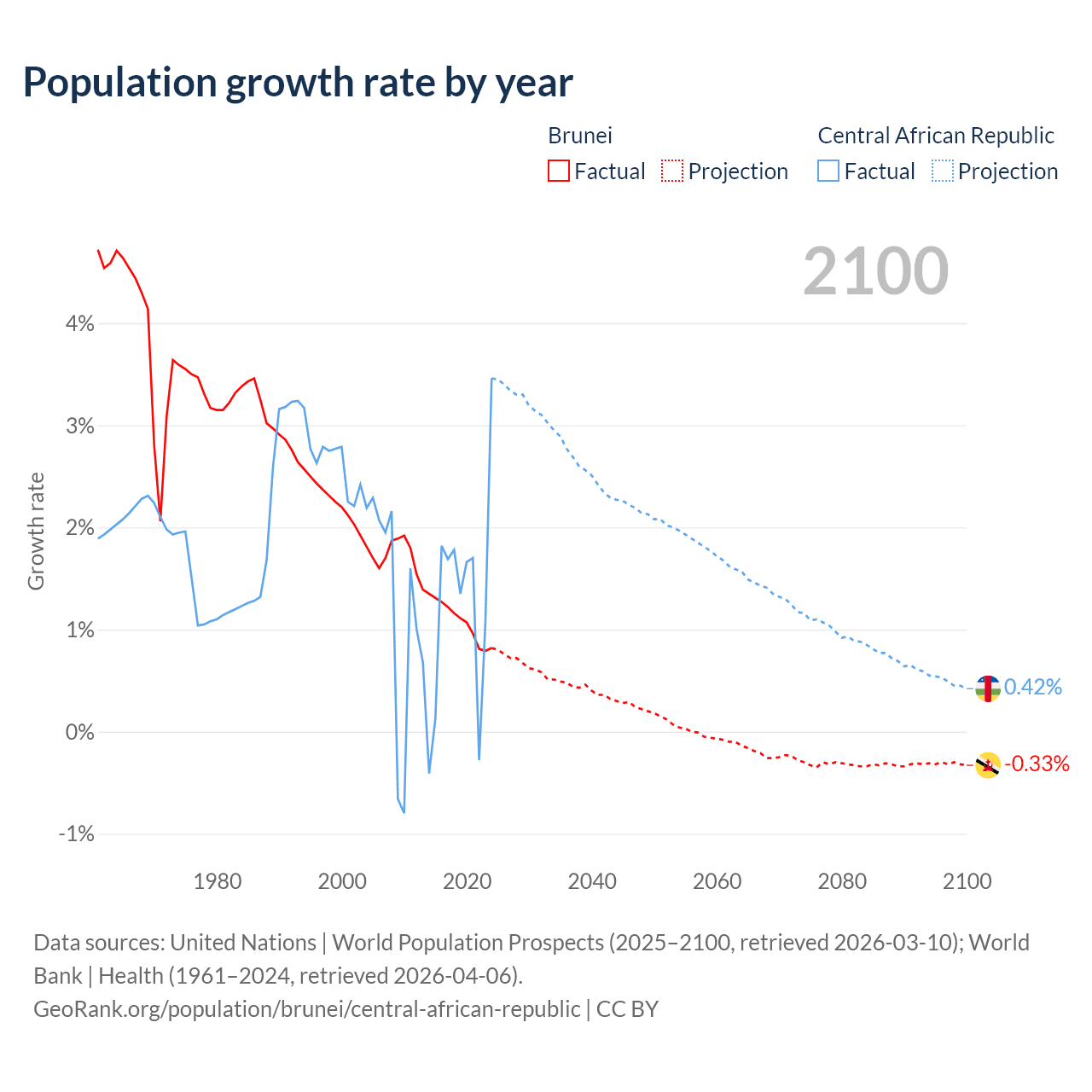 Data sources: World Bank | Health (1960–2024, retrieved 2026-04-06); United Nations | World Population Prospects (1960–2026, retrieved 2026-03-10); U.S. Census Bureau (1960–2025, retrieved 2026-02-08); Central Intelligence Agency (CIA) (2000–2019, retrieved 2026-02-20).