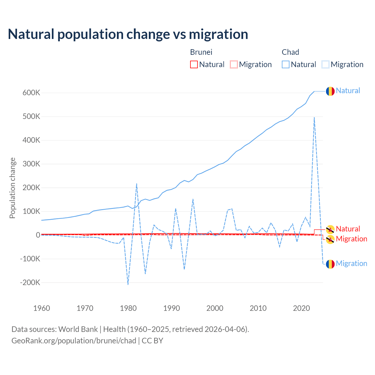 Over the last 10 years, 93.9% of the population change in Brunei is from natural causes (a gain of 43,993 people) and 6.15% is from migration (a gain of 2,882 people). In Chad 88.7% is from natural causes (a gain of 5,253,964 people) and 11.3% is from migration (a gain of 672,204 people).