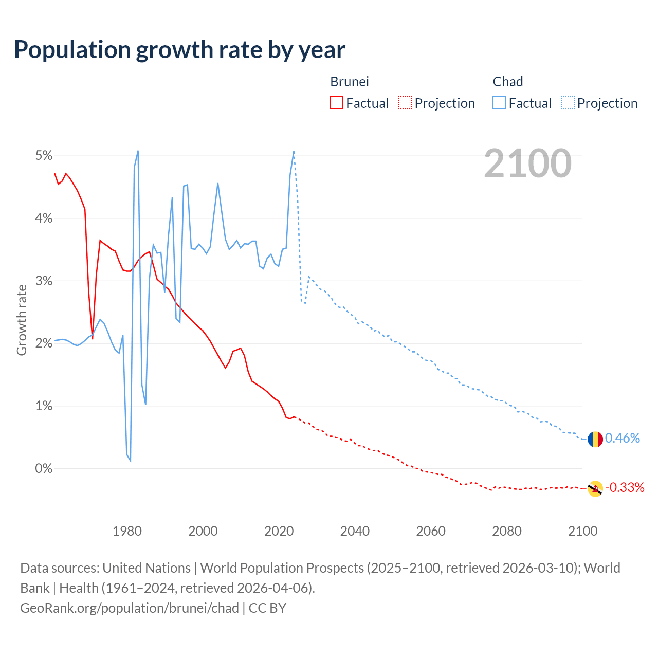 - For the last 10 years, Brunei has had an average growth rate of +1.08% per year vs +3.65% in Chad.