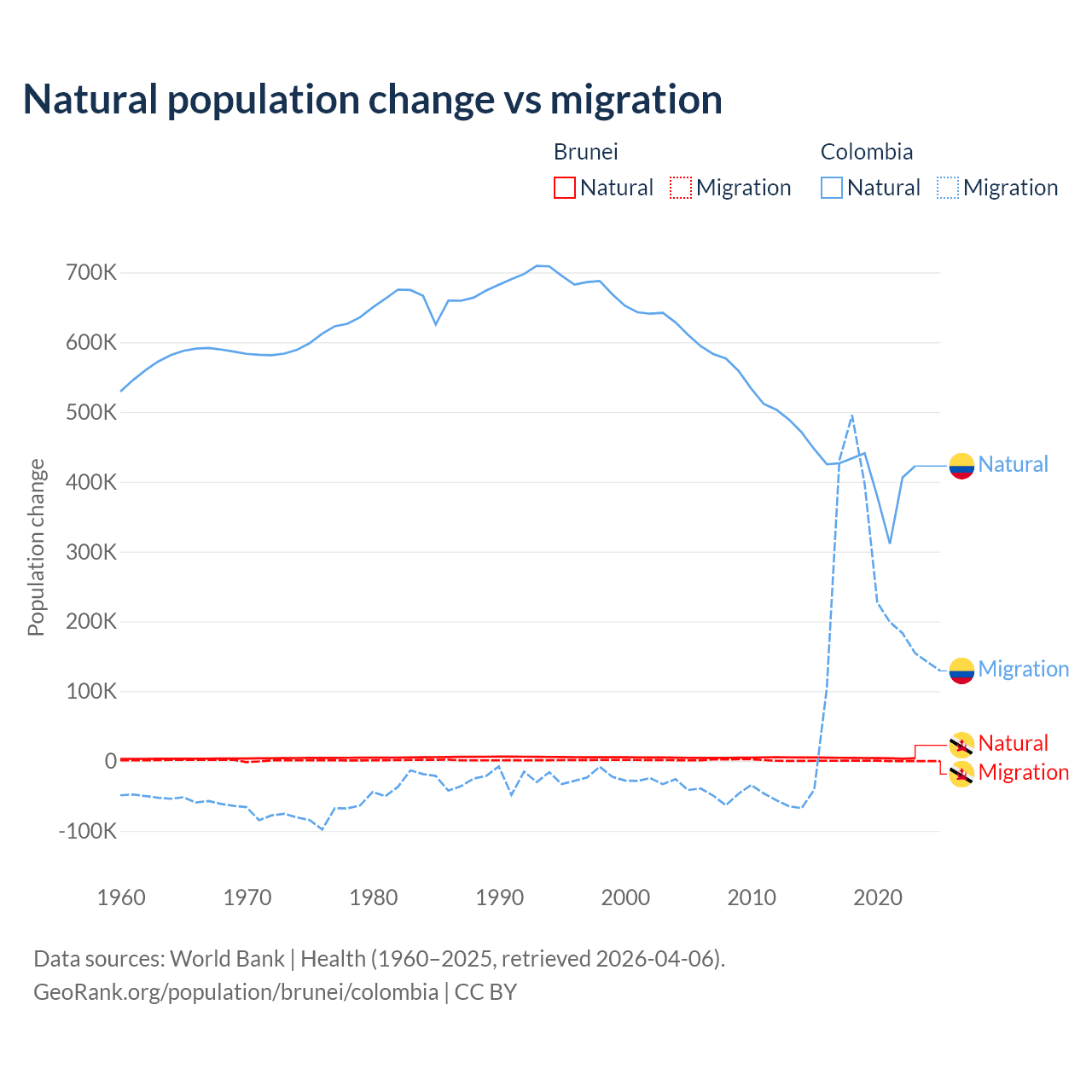 Over the last 10 years, 93.9% of the population change in Brunei is from natural causes (a gain of 43,993 people) and 6.15% is from migration (a gain of 2,882 people). In Colombia 66.6% is from natural causes (a gain of 4,162,856 people) and 33.4% is from migration (a gain of 2,083,051 people).