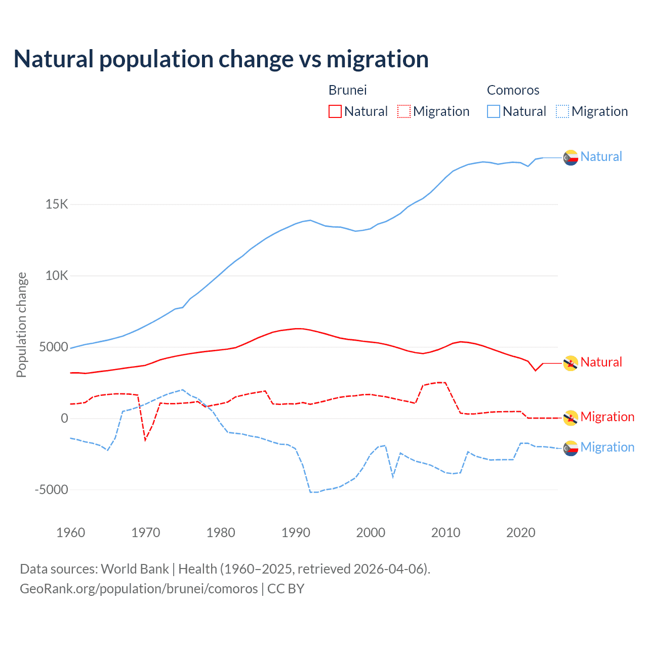Over the last 10 years, 93.9% of the population change in Brunei is from natural causes (a gain of 43,993 people) and 6.15% is from migration (a gain of 2,882 people). In Comoros 87.9% is from natural causes (a gain of 179,319 people) and 12.1% is from migration (a loss of 24,709 people).