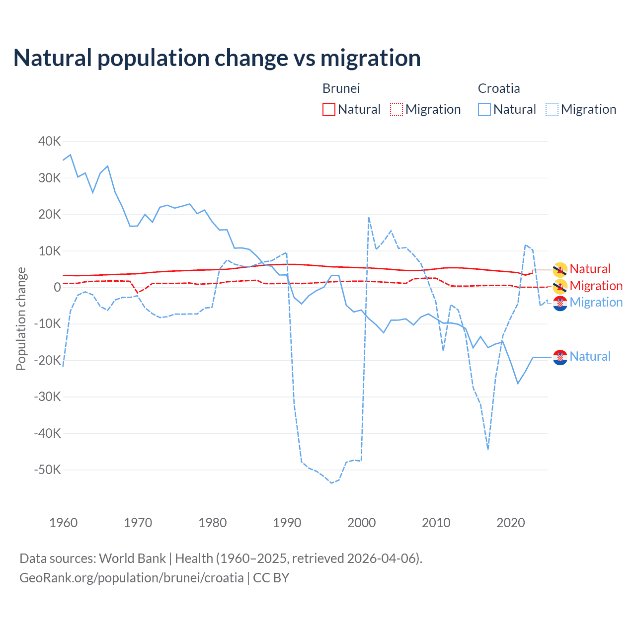 Over the last 10 years, 93.9% of the population change in Brunei is from natural causes (a gain of 43,993 people) and 6.15% is from migration (a gain of 2,882 people). In Croatia 54.8% is from natural causes (a loss of 177,803 people) and 45.2% is from migration (a loss of 146,770 people).