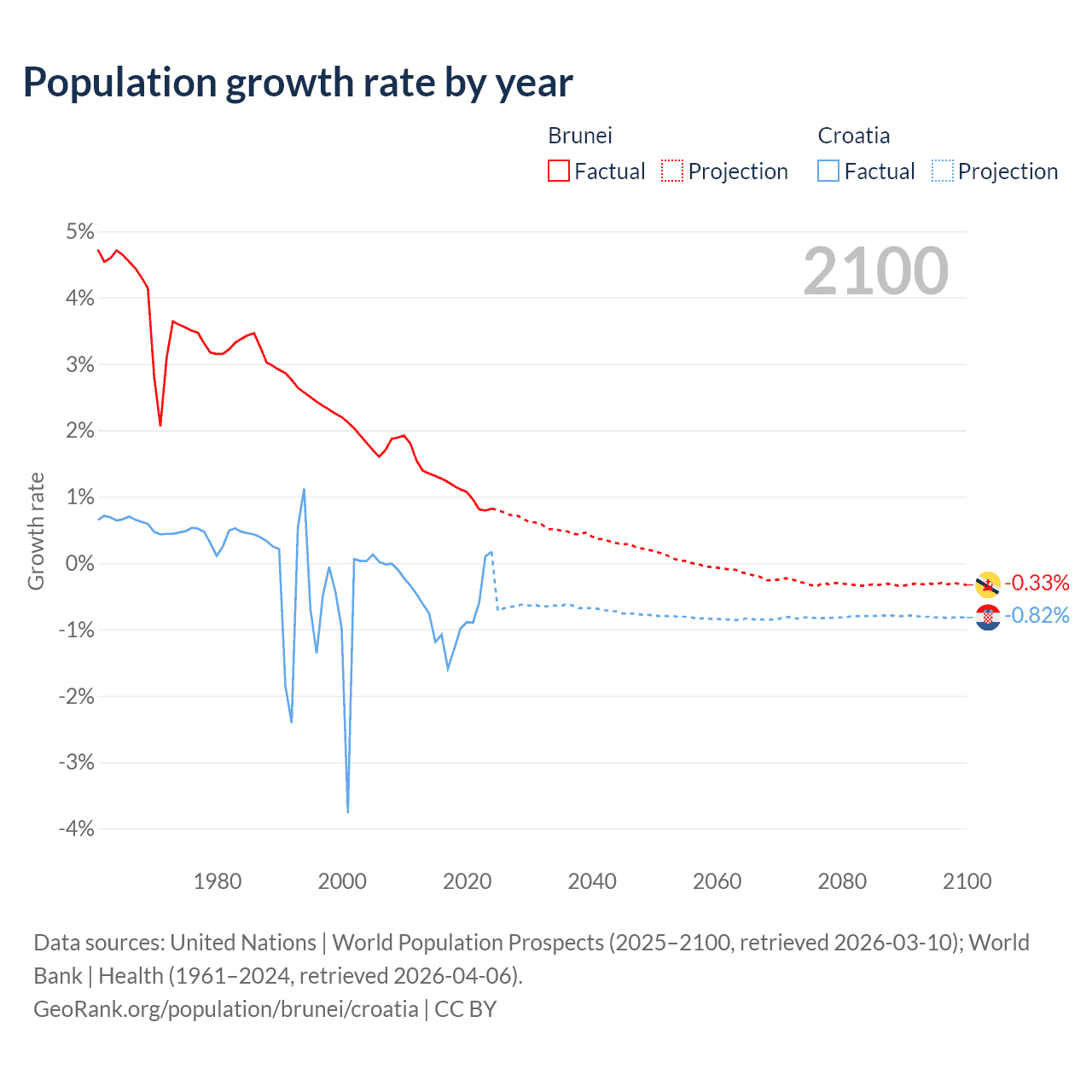 - For the last 10 years, Brunei has had an average growth rate of +1.08% per year vs -0.82% in Croatia.