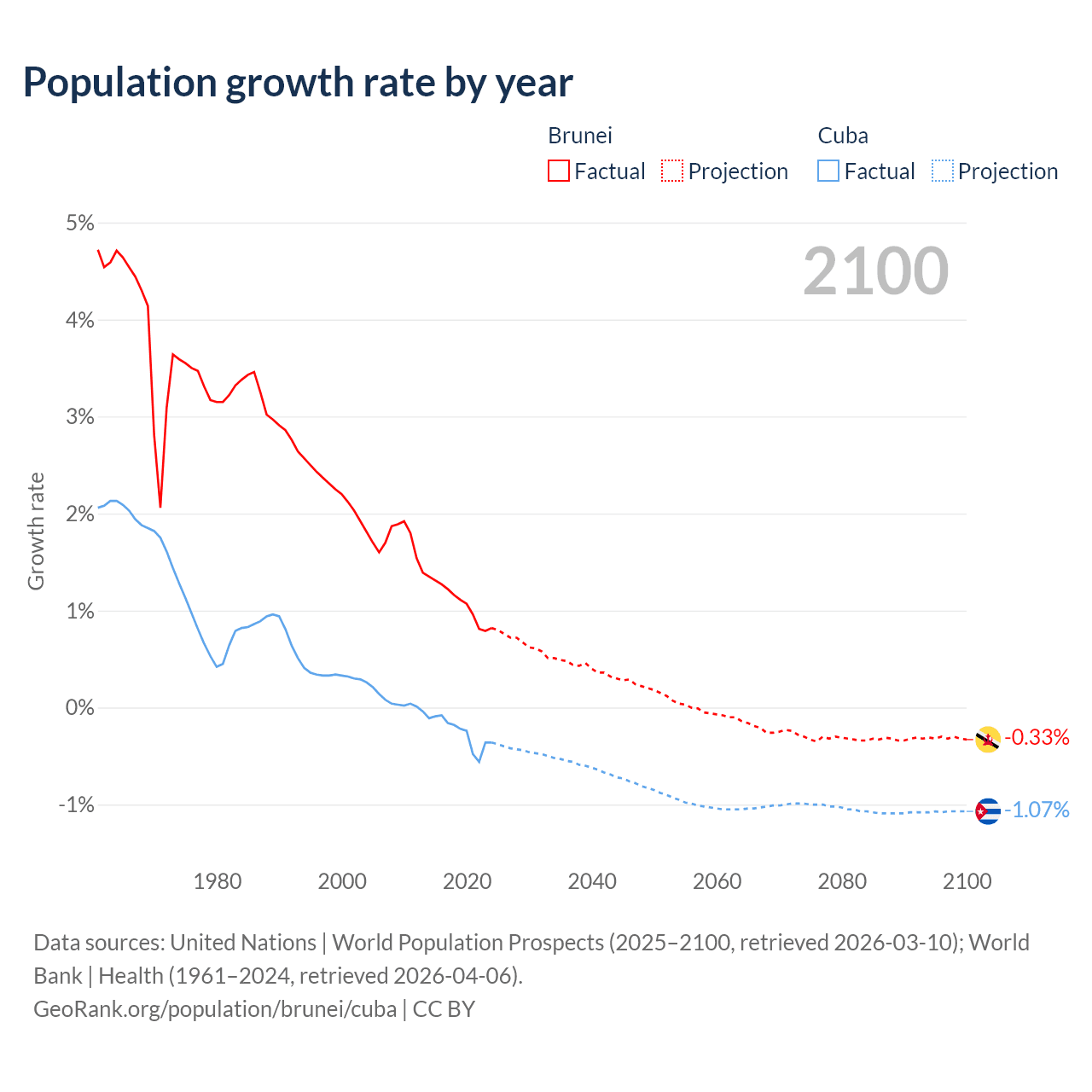 - For the last 10 years, Brunei has had an average growth rate of +1.08% per year vs -0.26% in Cuba.