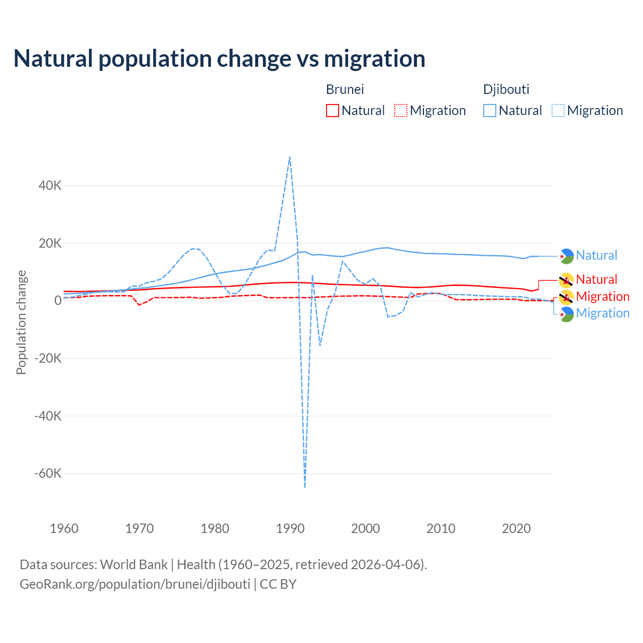 Over the last 10 years, 93.9% of the population change in Brunei is from natural causes (a gain of 43,993 people) and 6.15% is from migration (a gain of 2,882 people). In Djibouti 92.1% is from natural causes (a gain of 153,892 people) and 7.87% is from migration (a gain of 13,138 people).