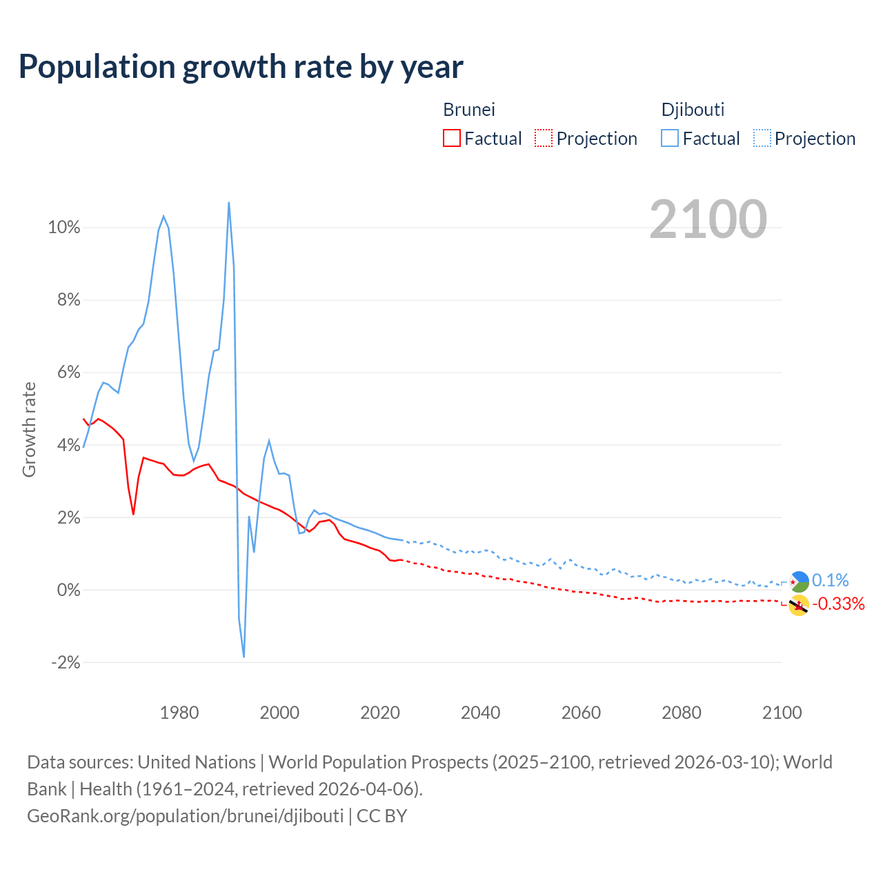 - For the last 10 years, Brunei has had an average growth rate of +1.08% per year vs +1.57% in Djibouti.
