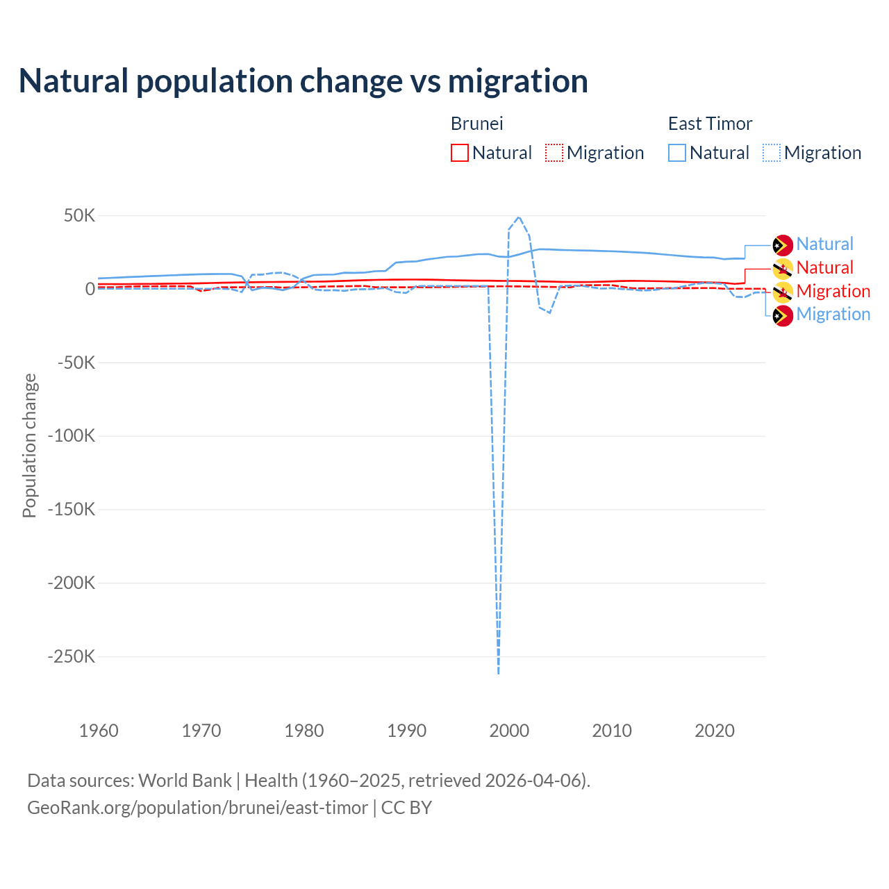 Over the last 10 years, 93.9% of the population change in Brunei is from natural causes (a gain of 43,993 people) and 6.15% is from migration (a gain of 2,882 people). In East Timor 98.3% is from natural causes (a gain of 217,698 people) and 1.66% is from migration (a gain of 3,665 people).