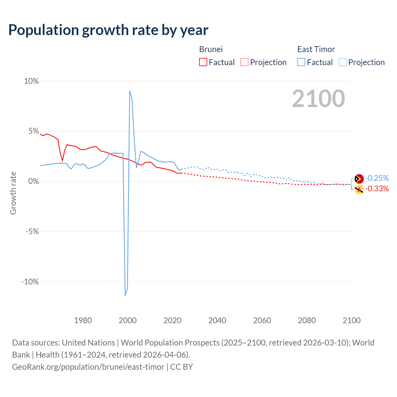 - For the last 10 years, Brunei has had an average growth rate of +1.08% per year vs +1.74% in East Timor.