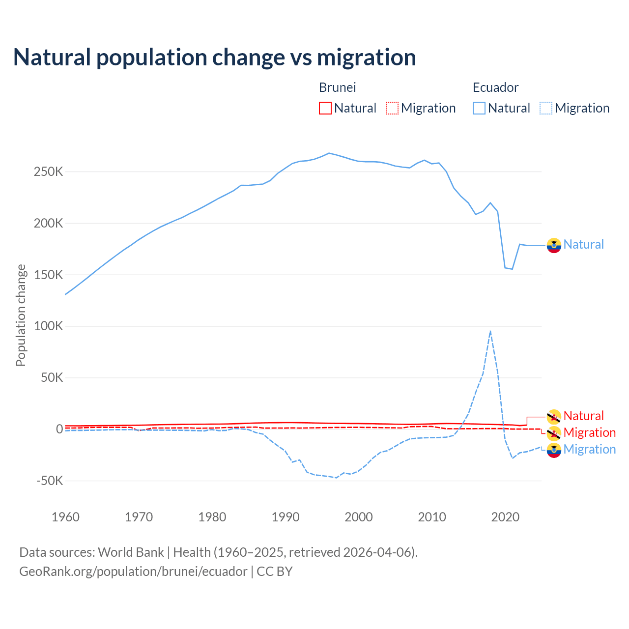 Over the last 10 years, 93.9% of the population change in Brunei is from natural causes (a gain of 43,993 people) and 6.15% is from migration (a gain of 2,882 people). In Ecuador 91.9% is from natural causes (a gain of 1,964,352 people) and 8.08% is from migration (a gain of 172,707 people).