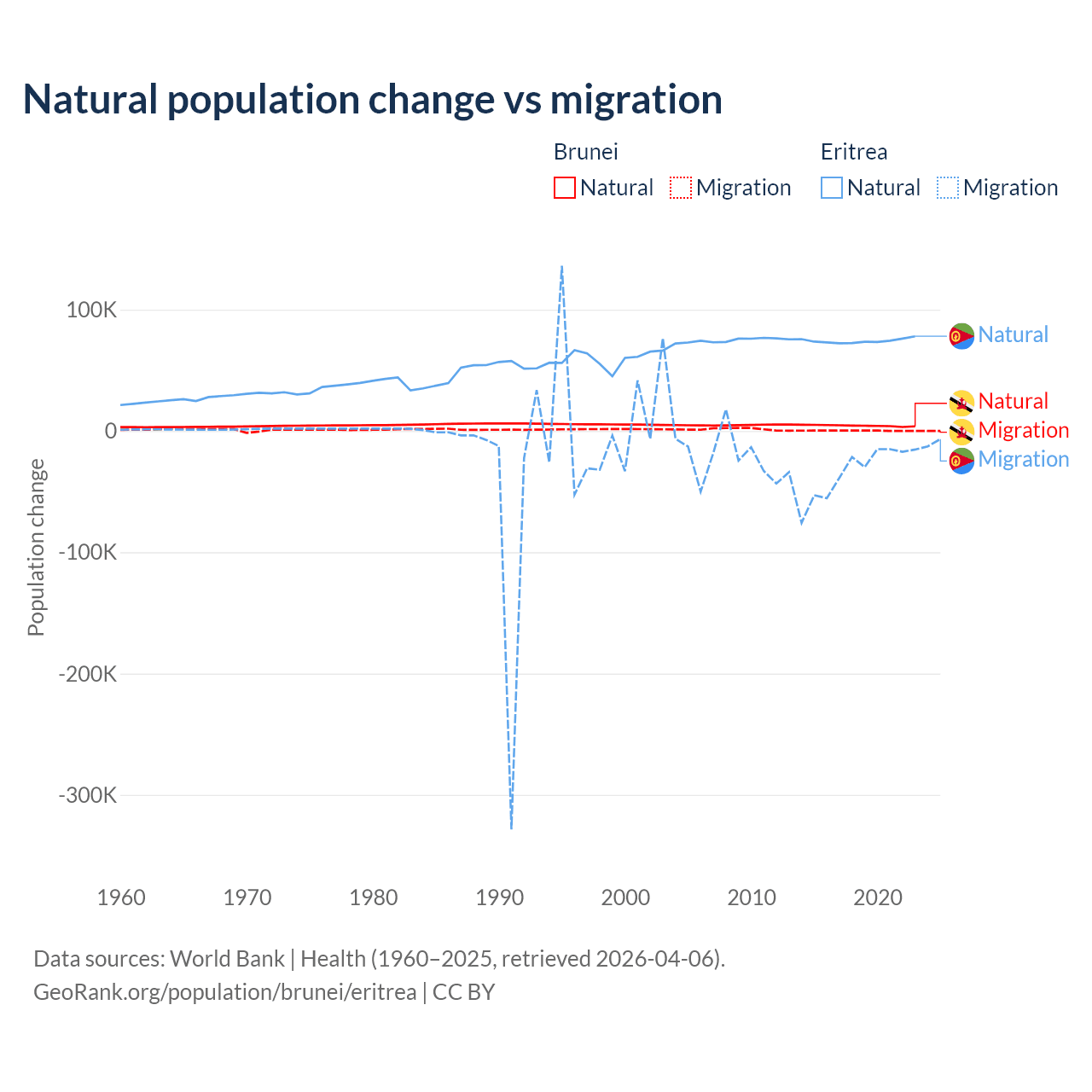Over the last 10 years, 93.9% of the population change in Brunei is from natural causes (a gain of 43,993 people) and 6.15% is from migration (a gain of 2,882 people). In Eritrea 68.8% is from natural causes (a gain of 742,837 people) and 31.2% is from migration (a loss of 336,243 people).
