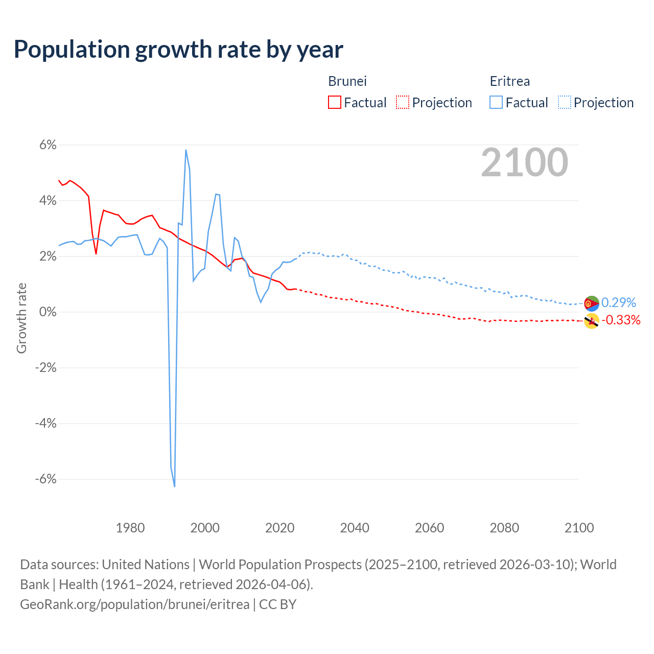 - For the last 10 years, Brunei has had an average growth rate of +1.08% per year vs +1.28% in Eritrea.