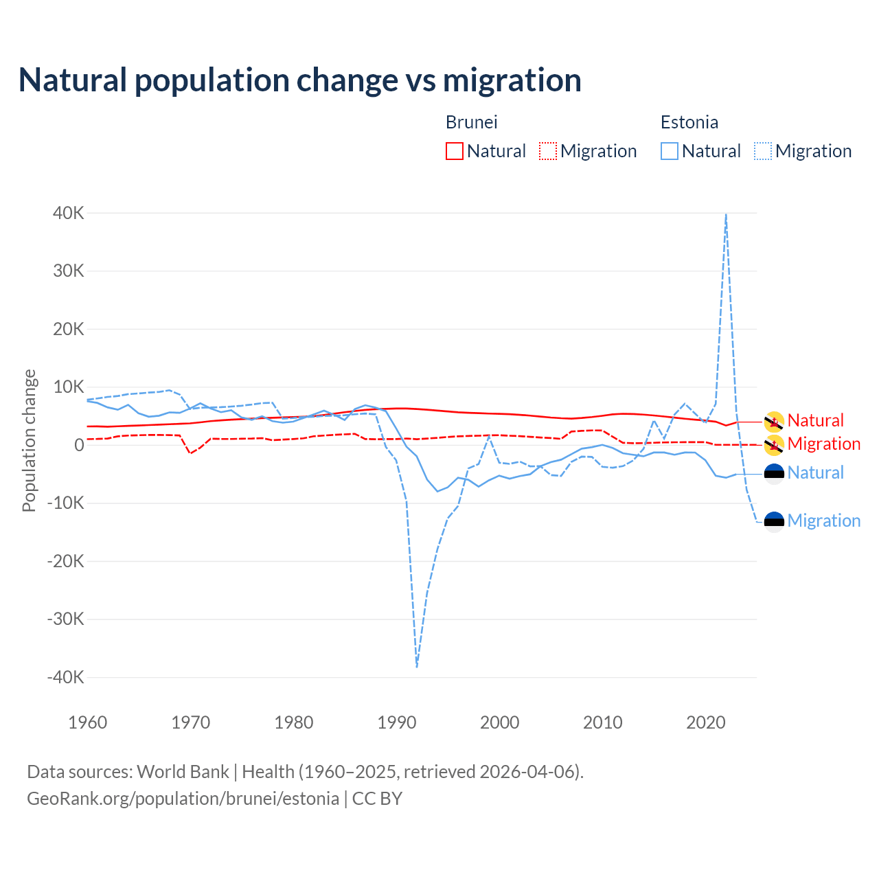 Over the last 10 years, 93.9% of the population change in Brunei is from natural causes (a gain of 43,993 people) and 6.15% is from migration (a gain of 2,882 people). In Estonia 26.1% is from natural causes (a loss of 27,683 people) and 73.9% is from migration (a gain of 78,553 people).