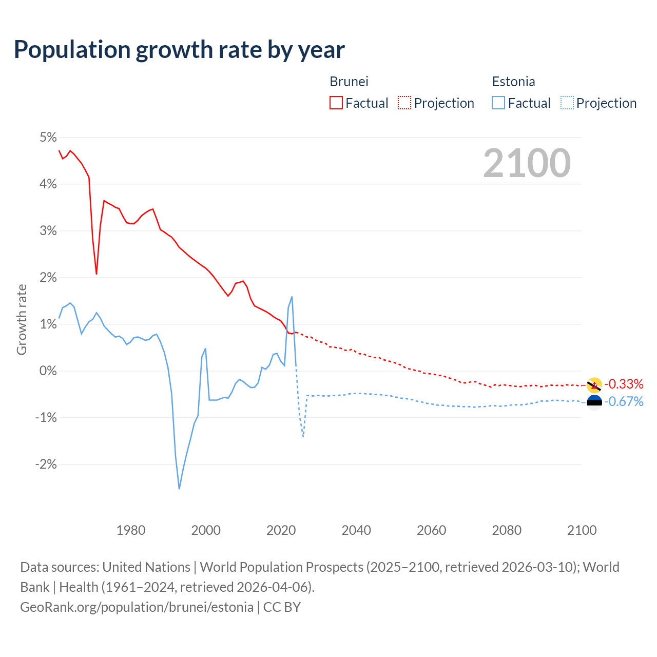 - For the last 10 years, Brunei has had an average growth rate of +1.08% per year vs +0.37% in Estonia.