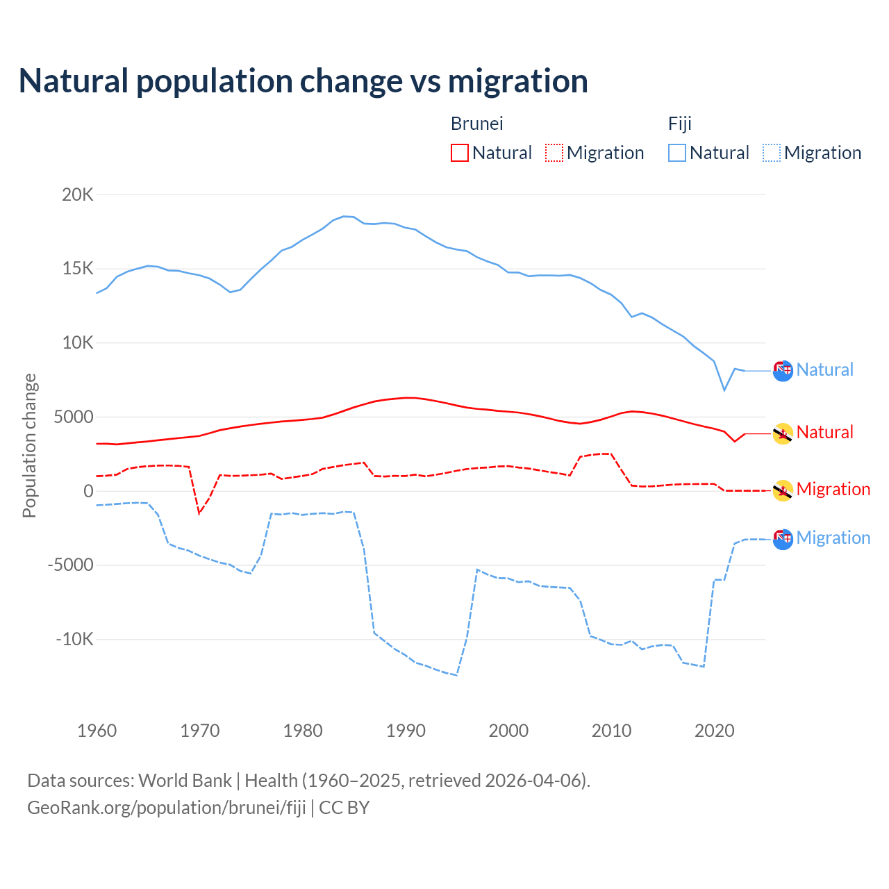 Over the last 10 years, 93.9% of the population change in Brunei is from natural causes (a gain of 43,993 people) and 6.15% is from migration (a gain of 2,882 people). In Fiji 52.6% is from natural causes (a gain of 94,971 people) and 47.4% is from migration (a loss of 85,415 people).