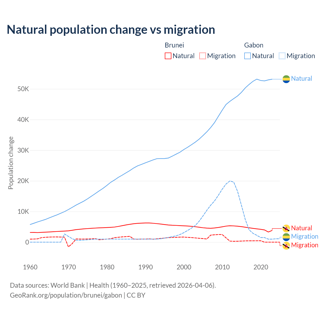 Over the last 10 years, 93.9% of the population change in Brunei is from natural causes (a gain of 43,993 people) and 6.15% is from migration (a gain of 2,882 people). In Gabon 91.1% is from natural causes (a gain of 515,484 people) and 8.86% is from migration (a gain of 50,119 people).