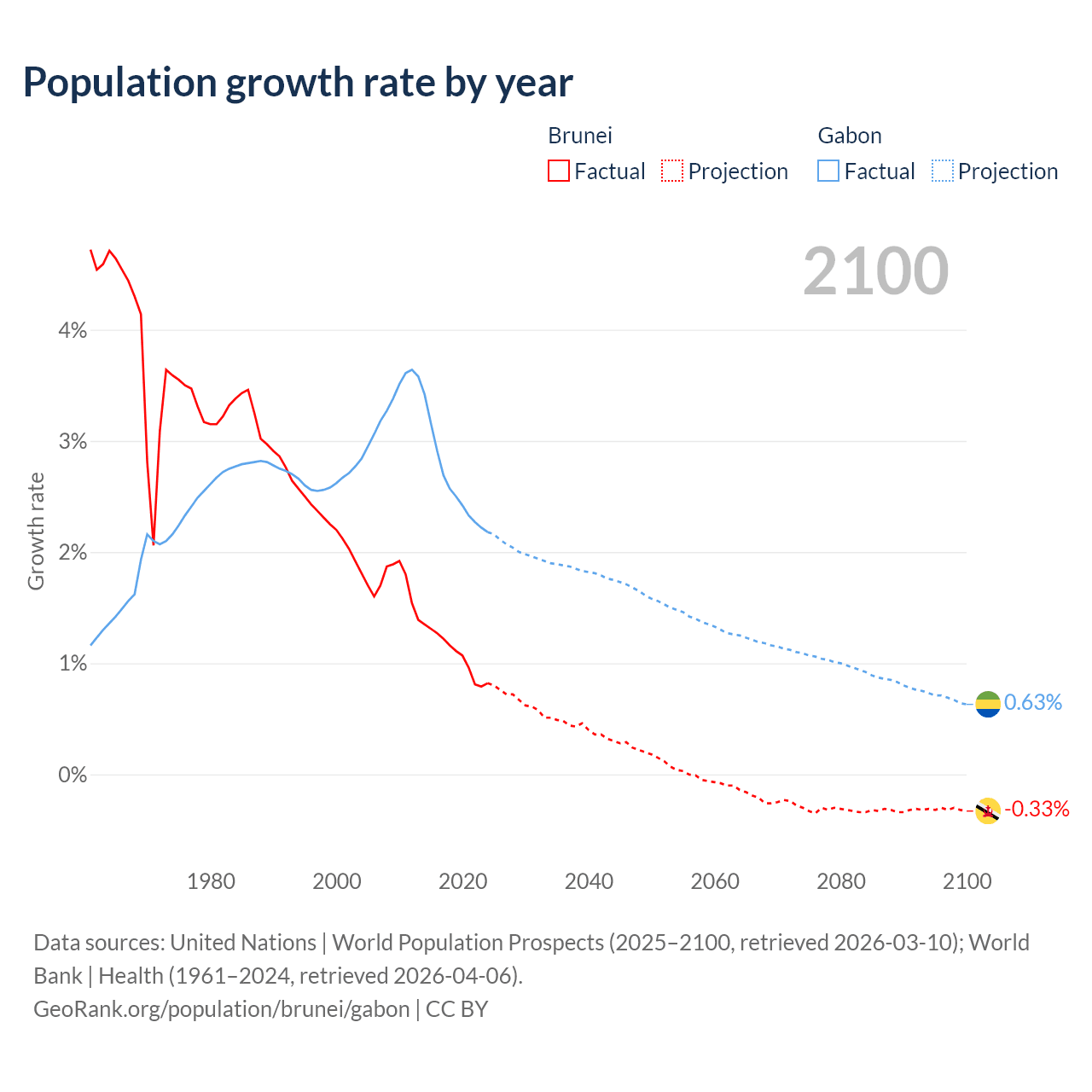 - For the last 10 years, Brunei has had an average growth rate of +1.08% per year vs +2.61% in Gabon.