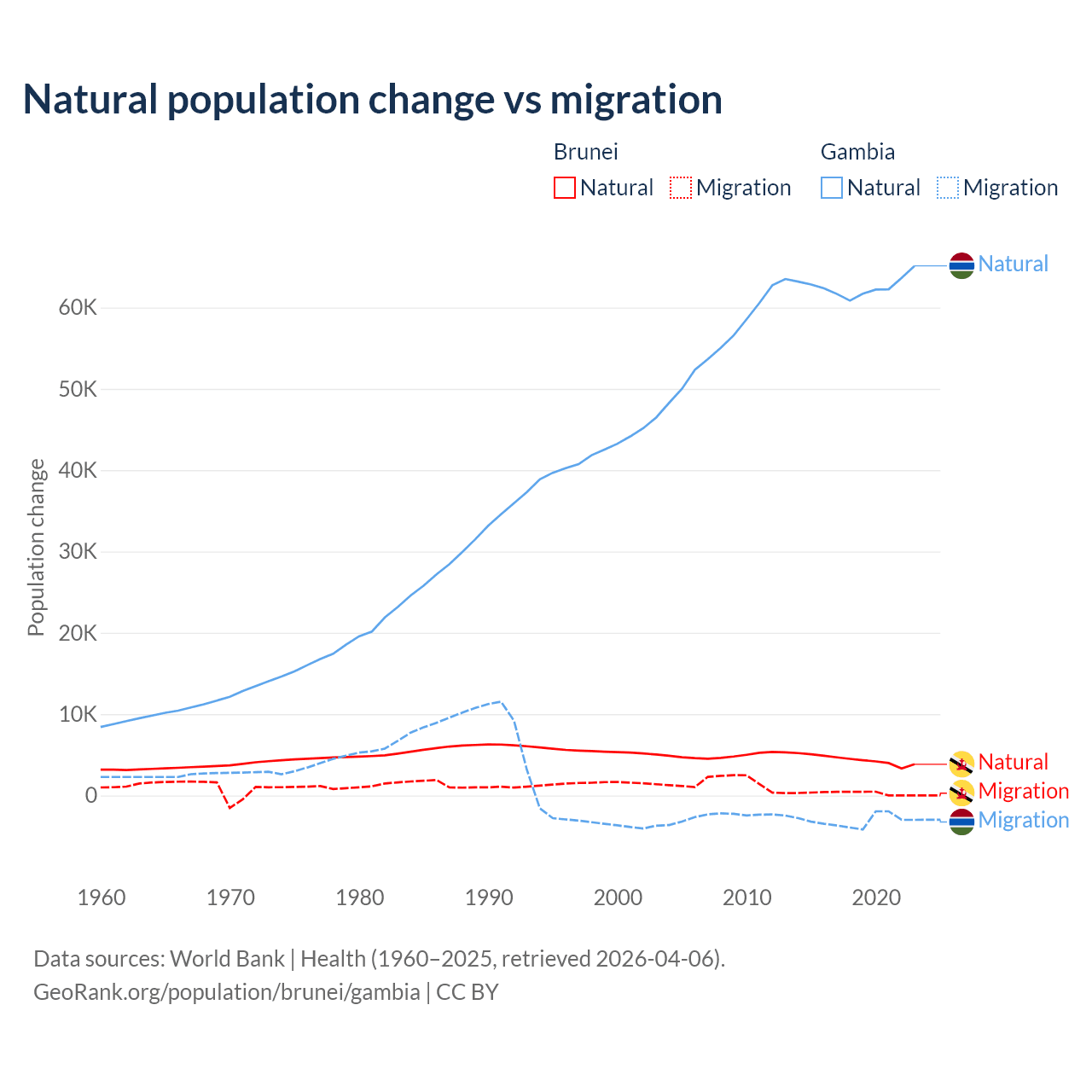 Over the last 10 years, 93.9% of the population change in Brunei is from natural causes (a gain of 43,993 people) and 6.15% is from migration (a gain of 2,882 people). In the Gambia 95.2% is from natural causes (a gain of 625,795 people) and 4.75% is from migration (a loss of 31,227 people).