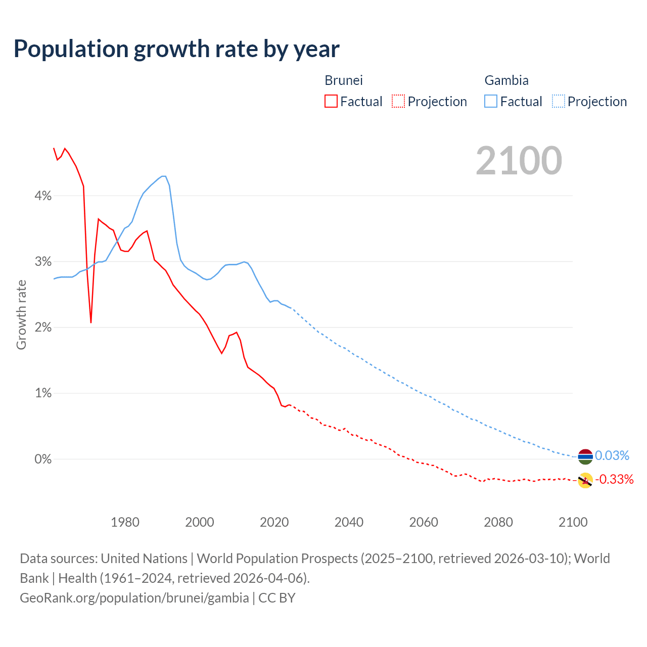 - For the last 10 years, Brunei has had an average growth rate of +1.08% per year vs +2.5% in the Gambia.