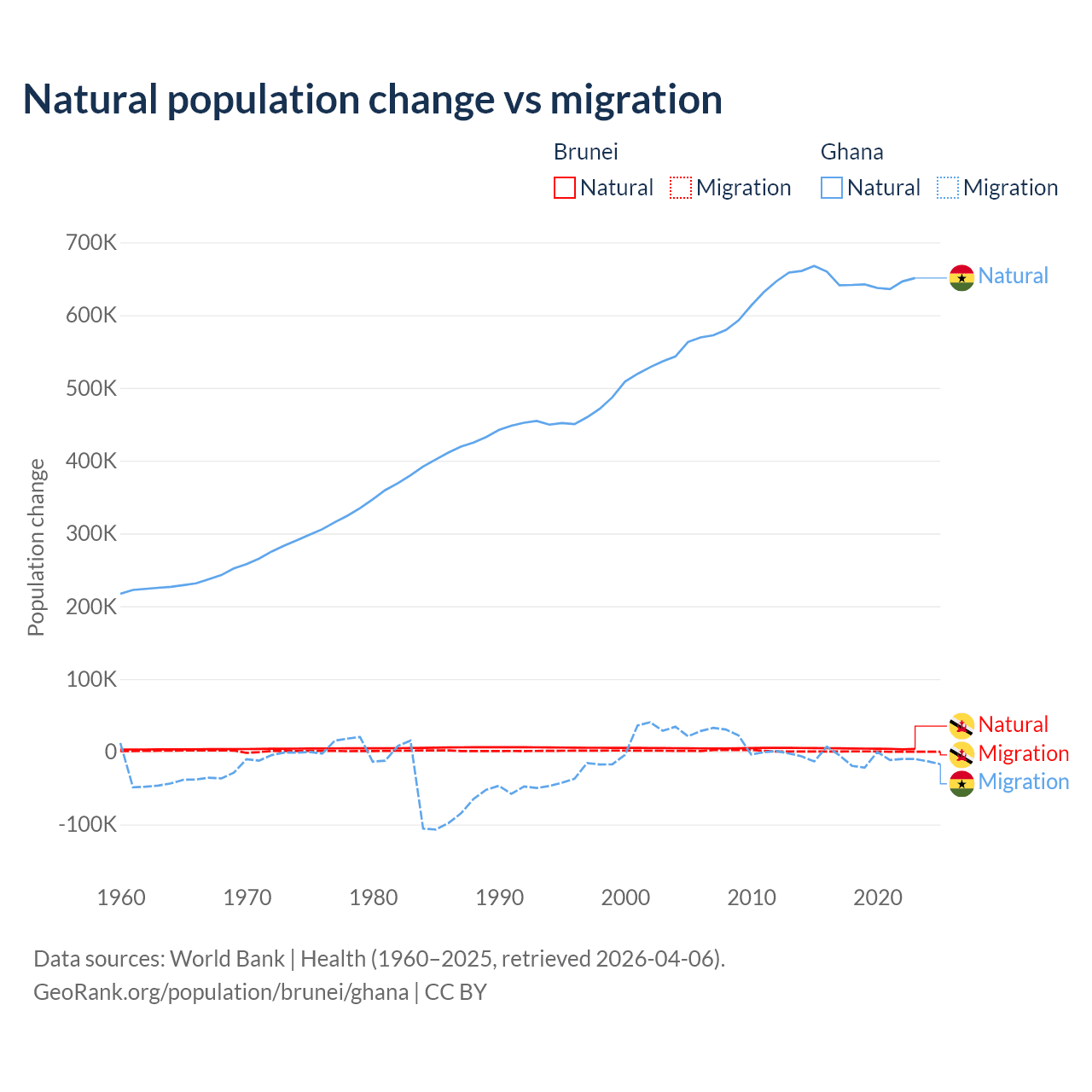 Over the last 10 years, 93.9% of the population change in Brunei is from natural causes (a gain of 43,993 people) and 6.15% is from migration (a gain of 2,882 people). In Ghana 98.6% is from natural causes (a gain of 6,484,449 people) and 1.37% is from migration (a loss of 90,310 people).