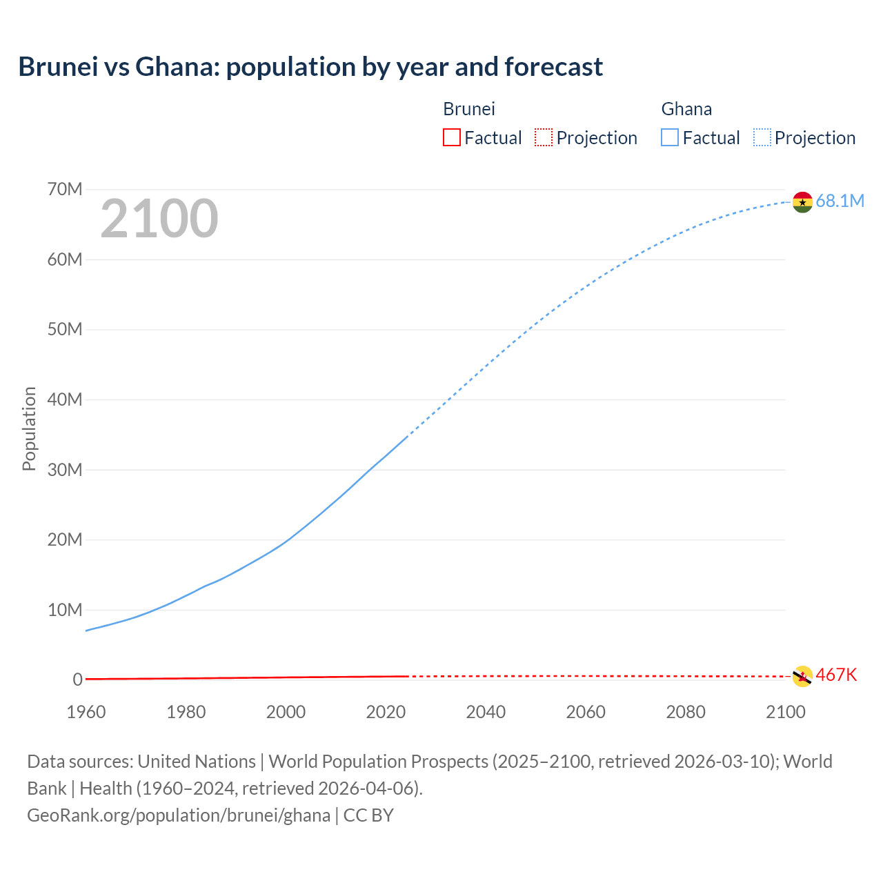 The latest officially reported population of Brunei was 462,721 in 2024 vs 34,427,414 people in Ghana in 2024. In 2026, based on the adjusted UN estimation, the current Brunei's population is 470,884 people compared to 35,885,254 in Ghana.