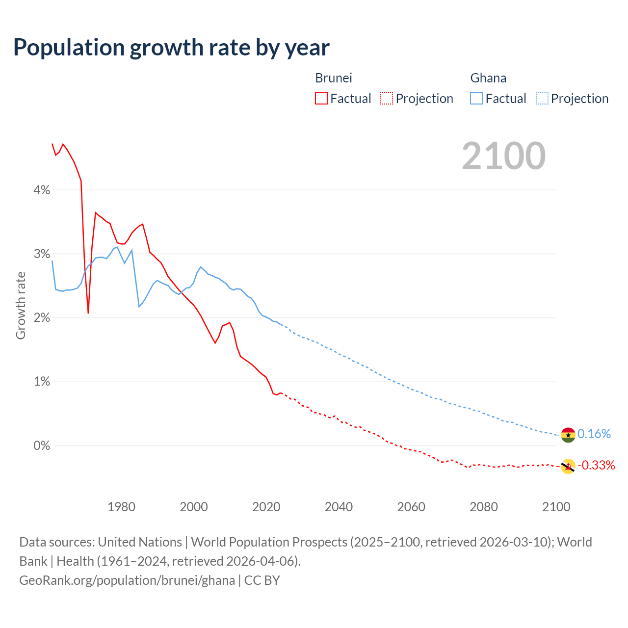 - For the last 10 years, Brunei has had an average growth rate of +1.08% per year vs +2.1% in Ghana.