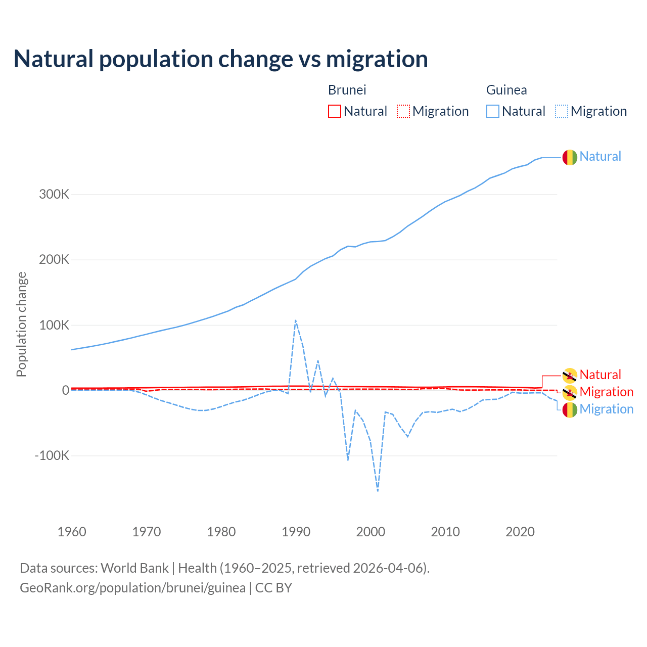 Over the last 10 years, 93.9% of the population change in Brunei is from natural causes (a gain of 43,993 people) and 6.15% is from migration (a gain of 2,882 people). In Guinea 97.2% is from natural causes (a gain of 3,346,936 people) and 2.76% is from migration (a loss of 94,924 people).