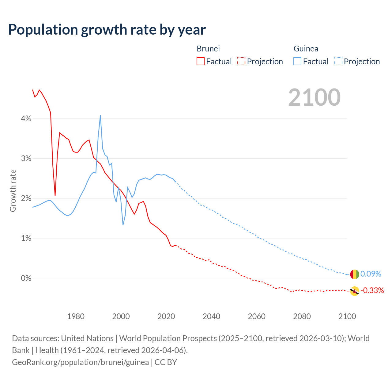 - For the last 10 years, Brunei has had an average growth rate of +1.08% per year vs +2.54% in Guinea.