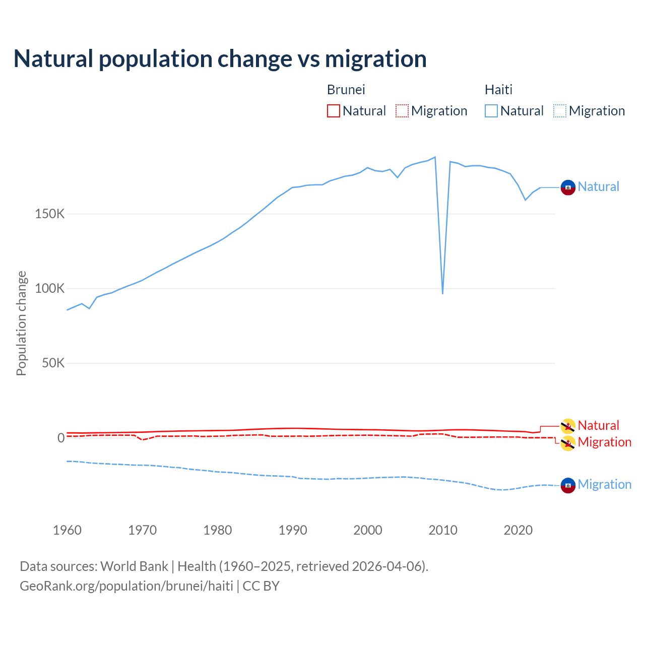 Over the last 10 years, 93.9% of the population change in Brunei is from natural causes (a gain of 43,993 people) and 6.15% is from migration (a gain of 2,882 people). In Haiti 83.9% is from natural causes (a gain of 1,740,319 people) and 16.1% is from migration (a loss of 333,076 people).