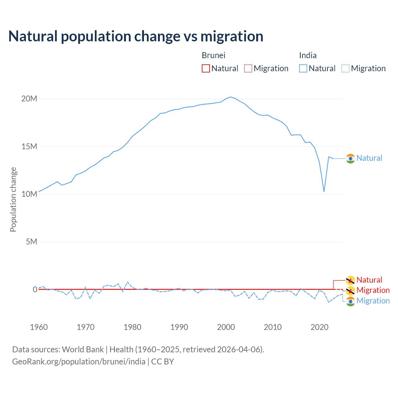 Over the last 10 years, 93.9% of the population change in Brunei is from natural causes (a gain of 43,993 people) and 6.15% is from migration (a gain of 2,882 people). In India 96.4% is from natural causes (a gain of 145,503,378 people) and 3.56% is from migration (a loss of 5,376,884 people).