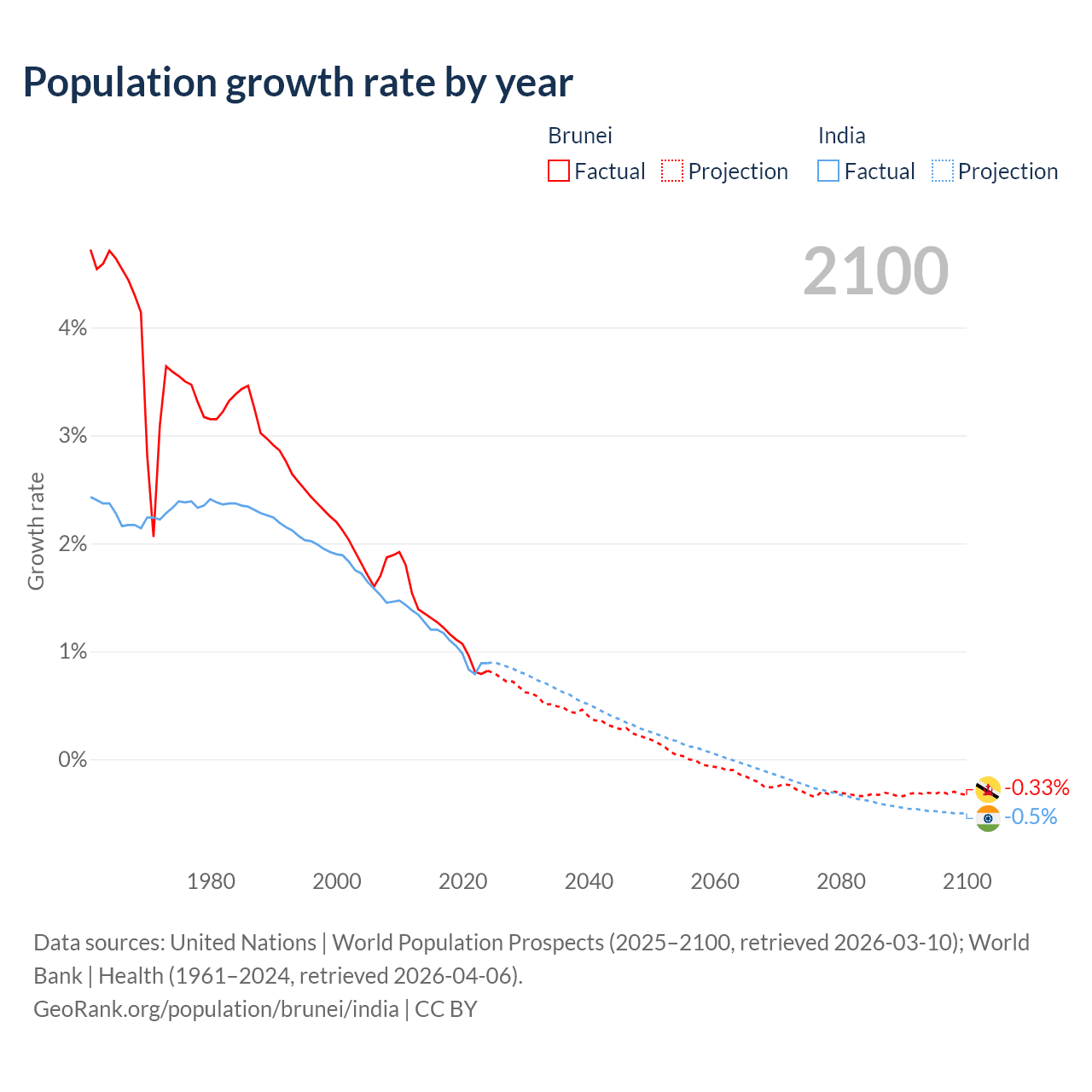 - For the last 10 years, Brunei has had an average growth rate of +1.08% per year vs +1.03% in India.