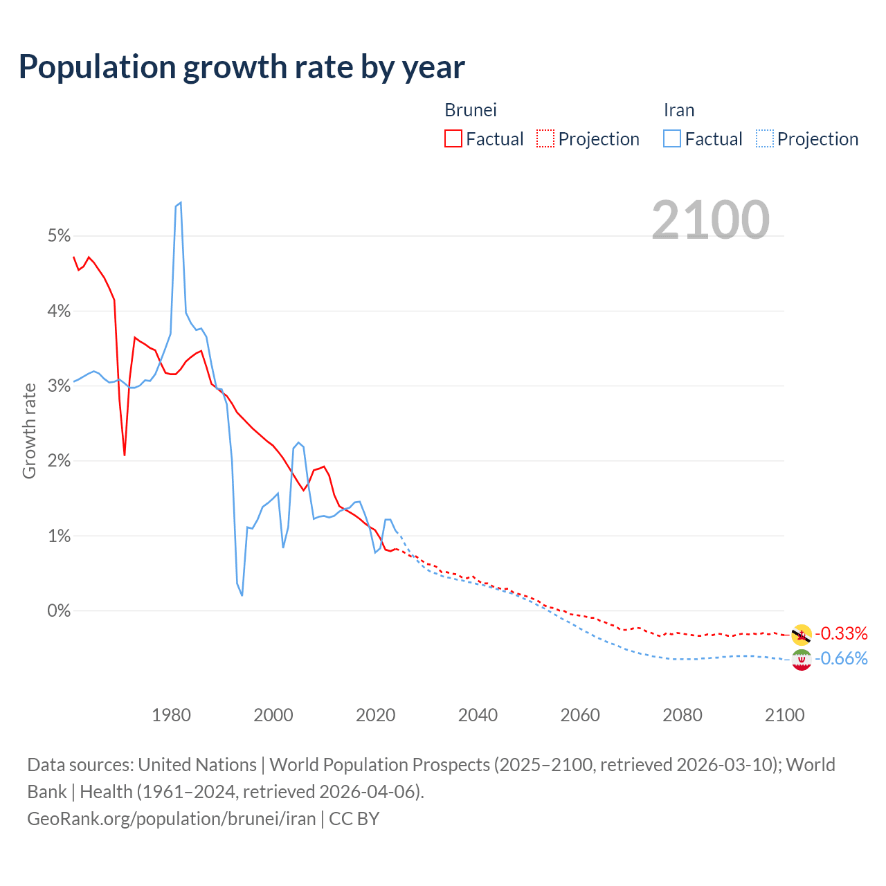 - For the last 10 years, Brunei has had an average growth rate of +1.08% per year vs +1.19% in Iran.
