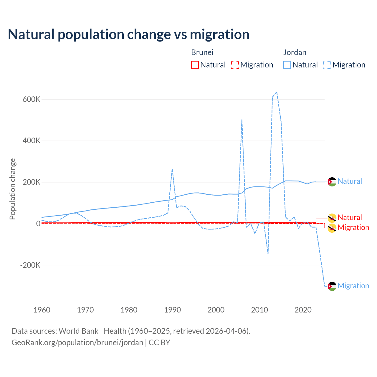 Over the last 10 years, 93.9% of the population change in Brunei is from natural causes (a gain of 43,993 people) and 6.15% is from migration (a gain of 2,882 people). In Jordan 63.2% is from natural causes (a gain of 1,991,452 people) and 36.8% is from migration (a gain of 1,157,625 people).