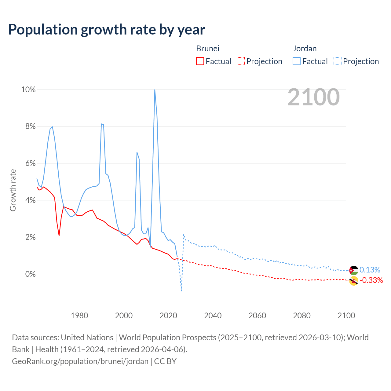 - For the last 10 years, Brunei has had an average growth rate of +1.08% per year vs +3.45% in Jordan.
