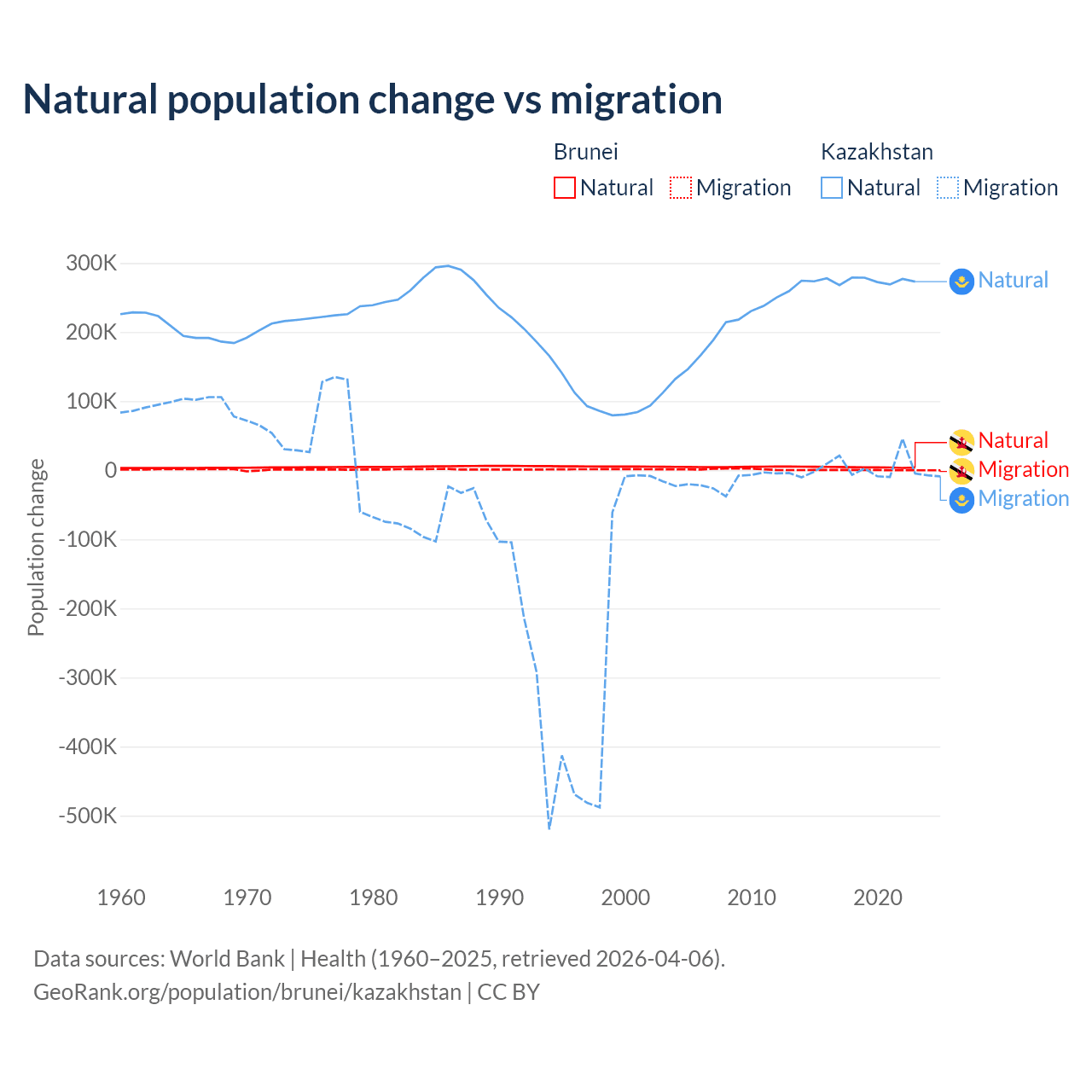 Over the last 10 years, 93.9% of the population change in Brunei is from natural causes (a gain of 43,993 people) and 6.15% is from migration (a gain of 2,882 people). In Kazakhstan 98.7% is from natural causes (a gain of 2,743,094 people) and 1.33% is from migration (a gain of 36,908 people).