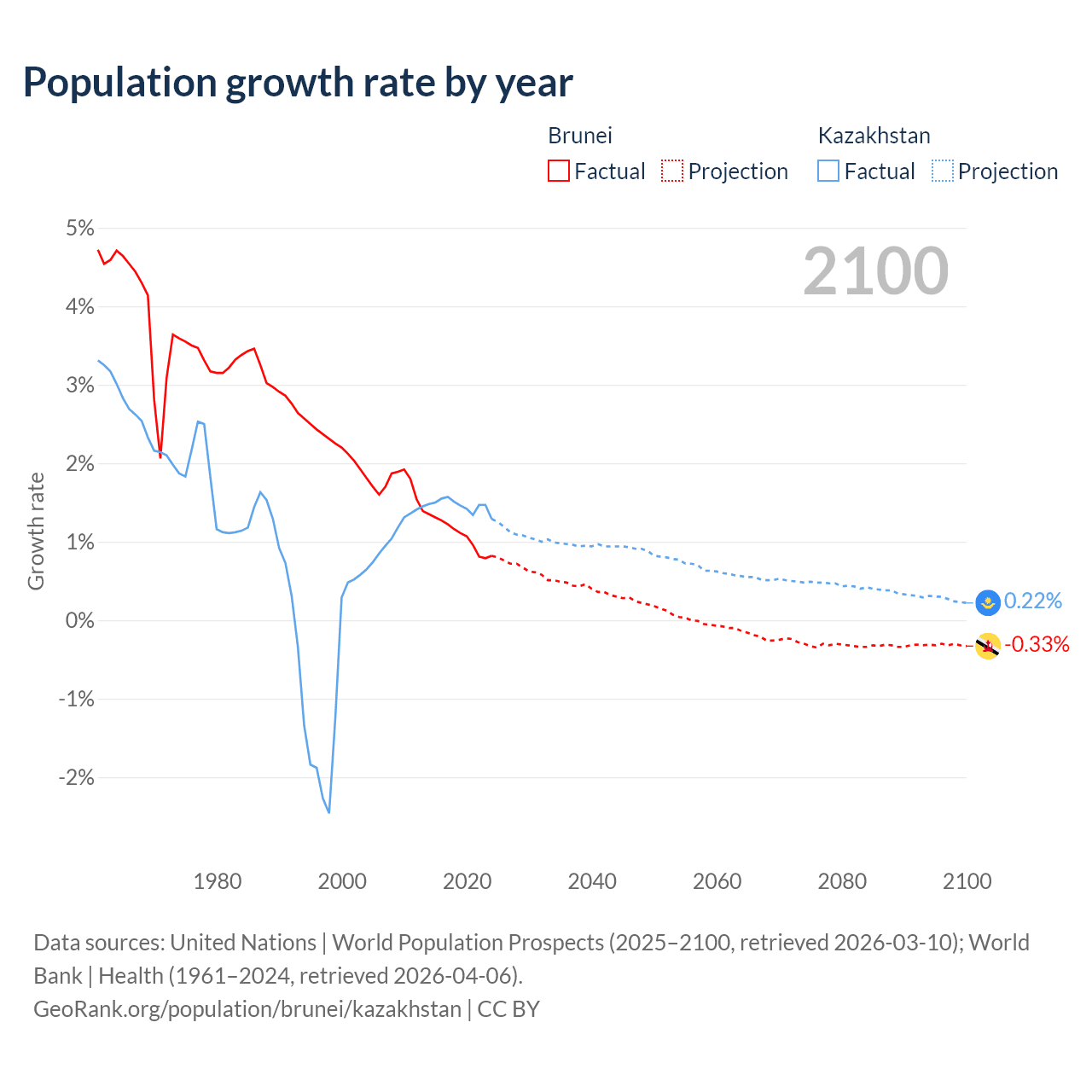 - For the last 10 years, Brunei has had an average growth rate of +1.08% per year vs +1.46% in Kazakhstan.