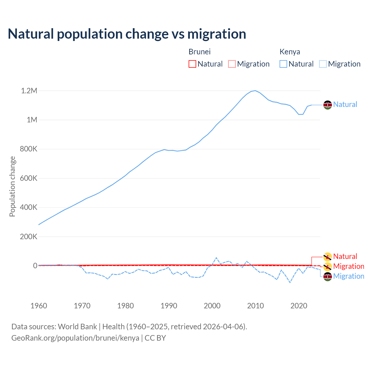 Over the last 10 years, 93.9% of the population change in Brunei is from natural causes (a gain of 43,993 people) and 6.15% is from migration (a gain of 2,882 people). In Kenya 95.3% is from natural causes (a gain of 10,892,362 people) and 4.67% is from migration (a loss of 533,876 people).