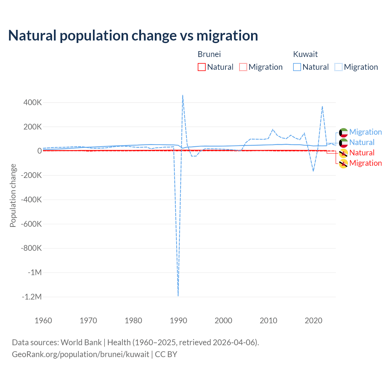 Over the last 10 years, 93.9% of the population change in Brunei is from natural causes (a gain of 43,993 people) and 6.15% is from migration (a gain of 2,882 people). In Kuwait 35.8% is from natural causes (a gain of 470,645 people) and 64.2% is from migration (a gain of 845,142 people).
