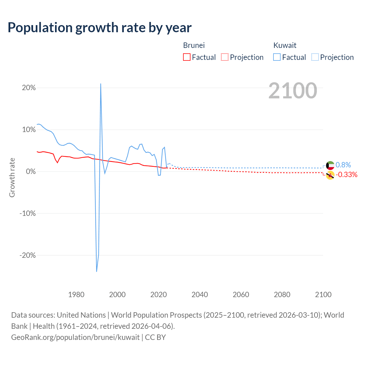 - For the last 10 years, Brunei has had an average growth rate of +1.08% per year vs +3.1% in Kuwait.