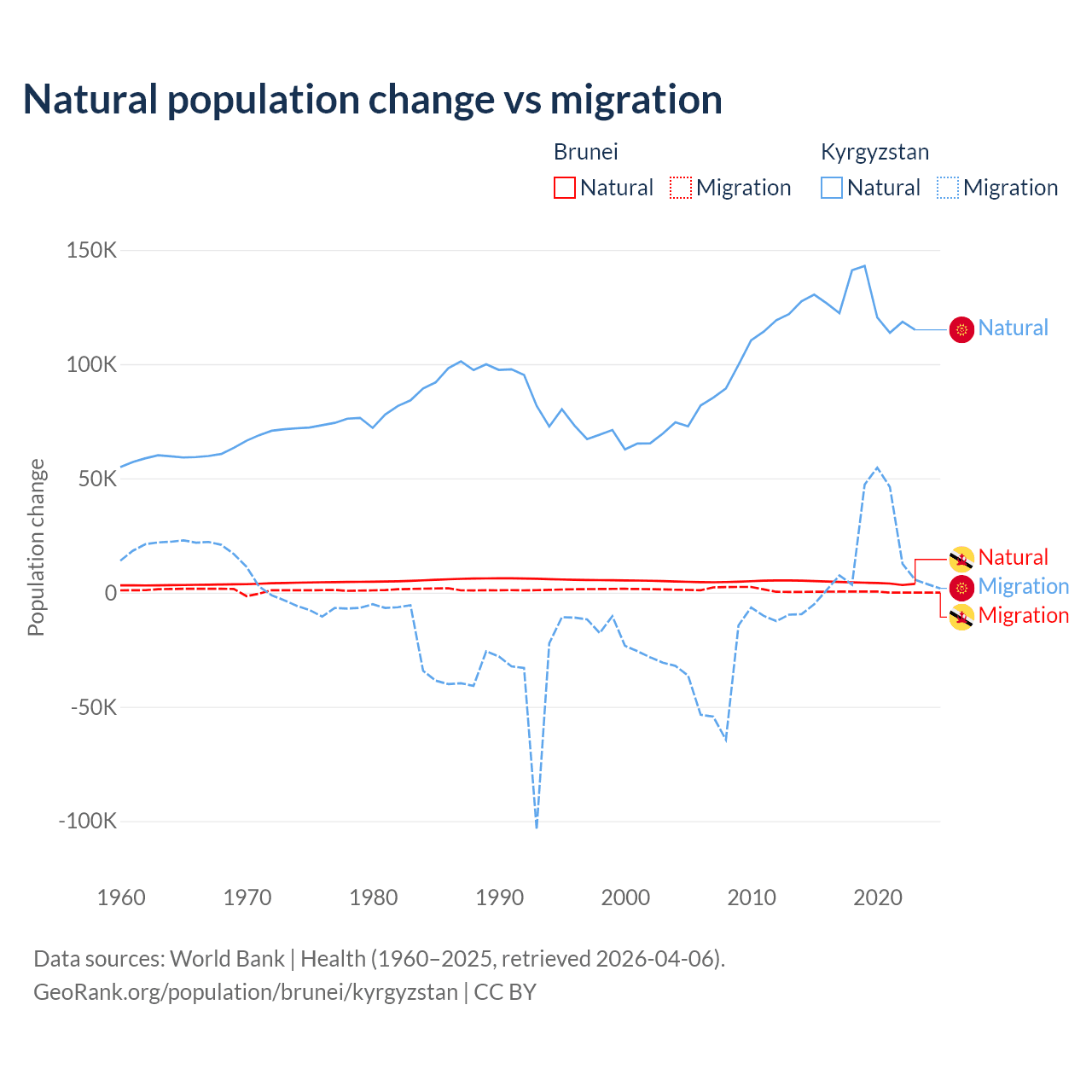 Over the last 10 years, 93.9% of the population change in Brunei is from natural causes (a gain of 43,993 people) and 6.15% is from migration (a gain of 2,882 people). In Kyrgyzstan 88.5% is from natural causes (a gain of 1,258,837 people) and 11.5% is from migration (a gain of 164,132 people).